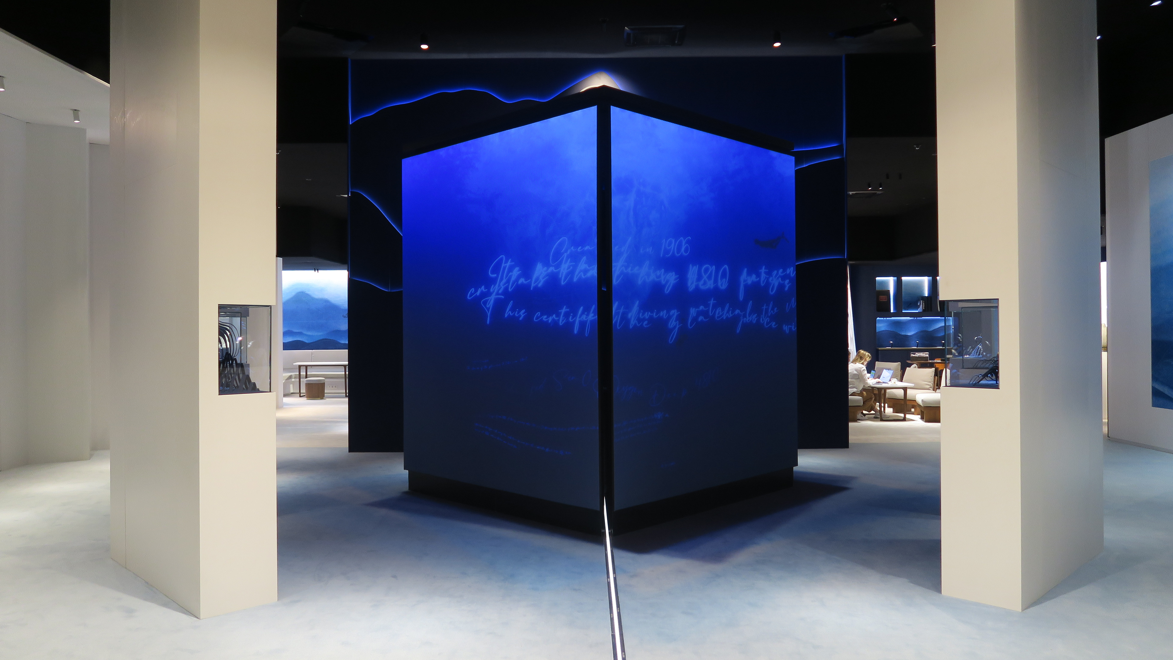 Création des environnements projetés, création d'un système de particules prenant la forme de phrases et reproduisant les effets du plancton lumineux, programmation des interactivités (tracking sur la face extérieur, détection de présence au niveau de la montre présentée à l'intérieur)
